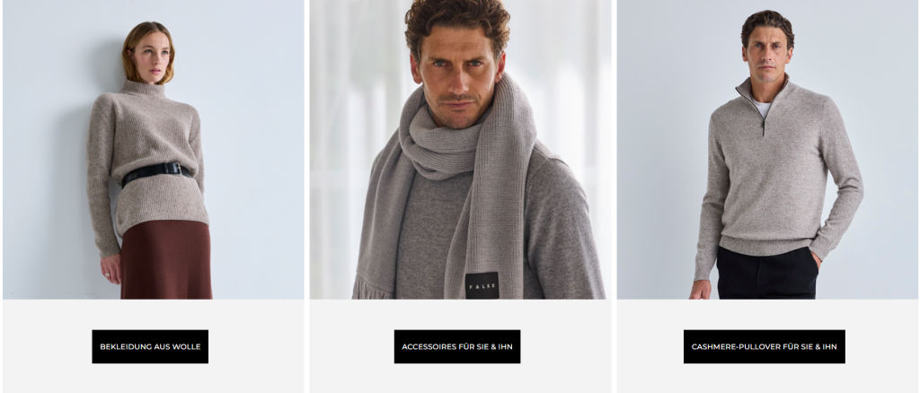 Beispiel: Die Kollektion „Luxury Line“ von FALKE verwendet Premium-Materialien wie Gemisch aus Merinowolle und Seide und zielt auf höchsten Anspruch.