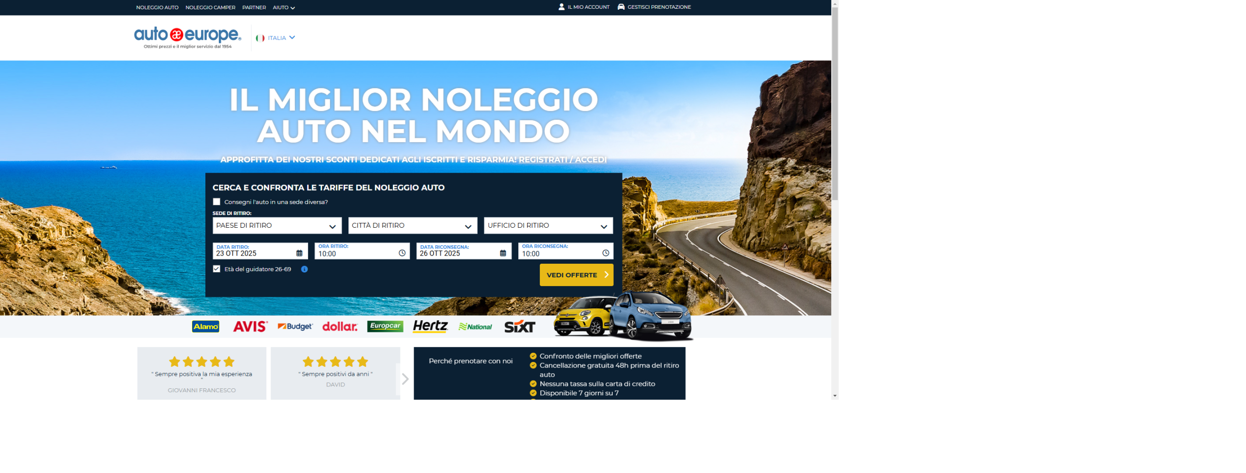 Hai in programma un viaggio in Italia o un weekend fuori porta? Trovare il noleggio auto giusto può trasformare la tua esperienza in qualcosa di davvero piacevole. Con Auto Europe puoi contare su prezzi competitivi, un’ampia gamma di veicoli e la sicurezza di un servizio affidabile, perfetto per muoverti in libertà in tutto il Paese.