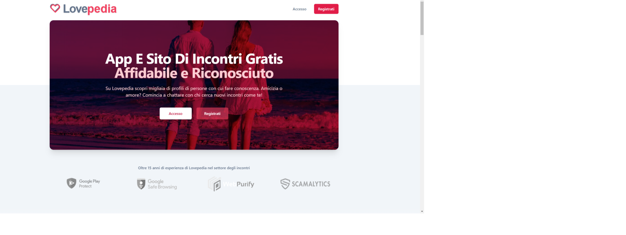 Il modo di conoscere persone è cambiato, ma il desiderio di connessioni vere resta lo stesso. Con Lovepedia puoi iniziare oggi a scrivere una nuova storia, con semplicità e autenticità. Registrarsi è gratuito, veloce e ti permette di entrare subito in contatto con migliaia di single pronti a conoscersi.