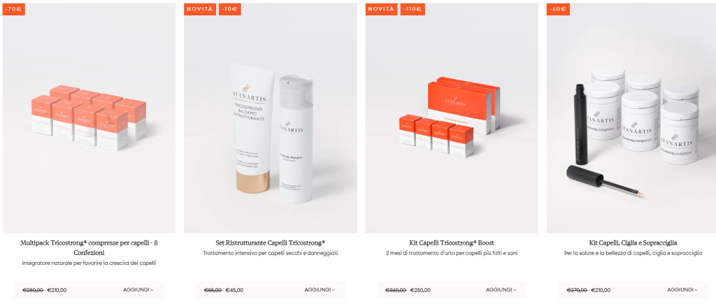 Entrando nello store di Stanartis si scopre un catalogo vasto, strutturato e completo. Per la cura dei capelli, i prodotti anticaduta e rinforzanti agiscono sulla radice, nutrendo il bulbo e stimolando la microcircolazione. Per la pelle, invece, le formule anti-età e illuminanti restituiscono tono, elasticità e luminosità, contrastando i segni del tempo e le discromie cutanee.
