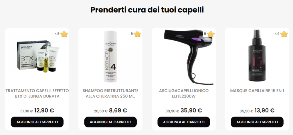 - Haircare e styling: shampoo, maschere, oli nutrienti e strumenti professionali per parrucchieri.
