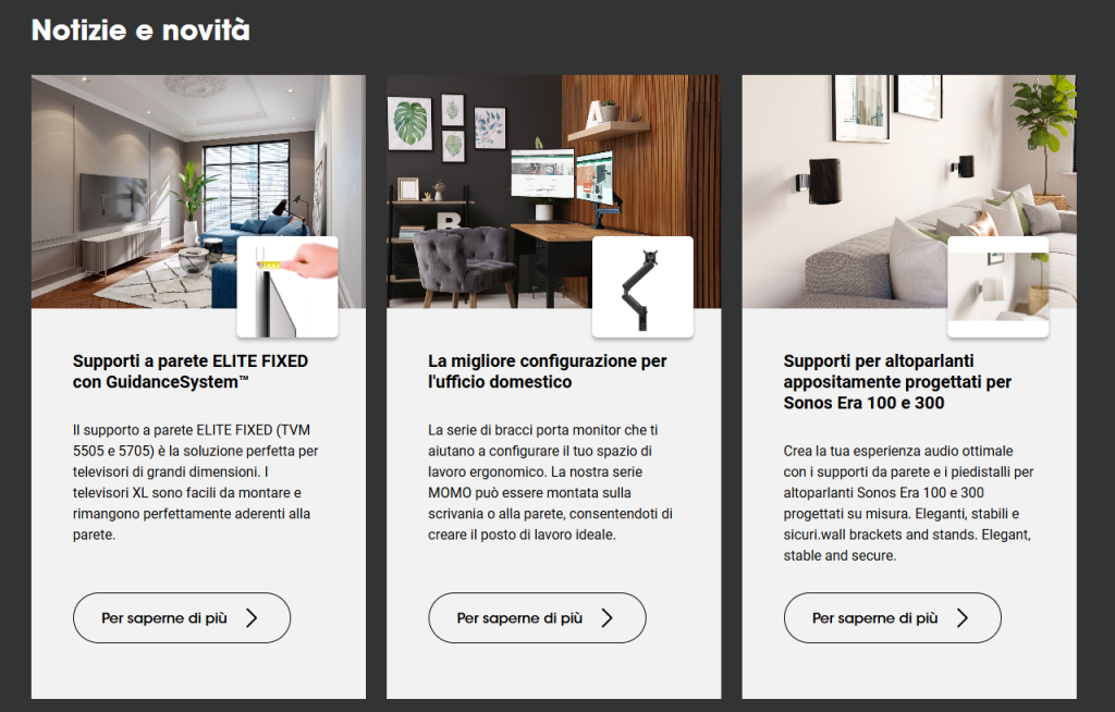 Esistono anche soluzioni pensate per le cucine, le camere da letto o gli ambienti più piccoli, dove un montaggio salvaspazio fa la differenza. Vogels offre inoltre accessori per la gestione dei cavi, per mantenere un aspetto ordinato e pulito senza compromettere l’estetica. Tutto è pensato per creare un ambiente armonico, dove la tecnologia si integra perfettamente con il design.