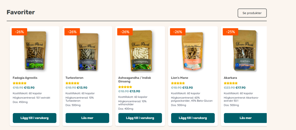 Det som gör Sonjas Apotek så uppskattat är ambitionen att erbjuda produkter som verkligen gör skillnad. Oavsett om kunden vill stärka sitt immunförsvar, vårda sin hud eller förbättra sin vardagliga energi finns alternativ som är utvalda med omsorg. Detta ger fördelen att kunderna slipper granska en djungel av produkter utan istället kan lita på att utbudet är noggrant sammansatt. Hos Sonjas Apotek är kvalitet alltid i fokus och det märks genom hela sortimentet.